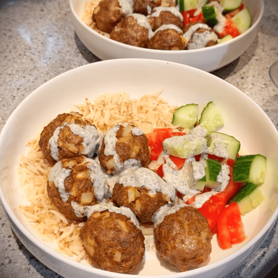 Split the rice between 3 plates, then top with the meatballs.